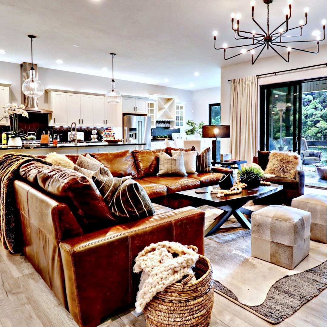 Curated soft furnishings, including luxury rugs, custom window treatments (curtains/blinds), decorative artwork, and premium textiles.
